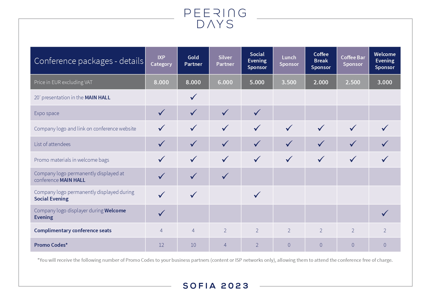 2 Promo Codes – you will receive the number of Promo Codes to your business partners (content or ISP networks only), allowing them to attend the conference free of charge